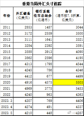 截至5月底,香港当局手里的外汇总头寸(外汇储备+收市总结余)下降到4267亿美元,恢复下行趋势。