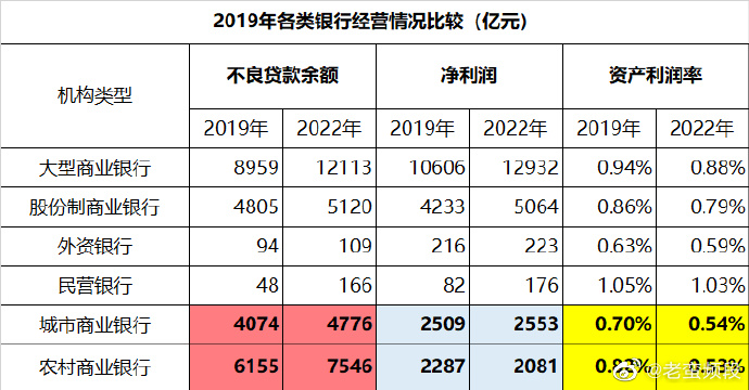 没忍住,在这里也说两句:农商行和城商行的经营情况,相对于其它类型的银行来说,实在是不算理想。资产利润率在近三年的降幅非常大,远远超过其它类型的银行。而不良贷款规模相对于它们的利润规模来说,又实在是大得太过分了。