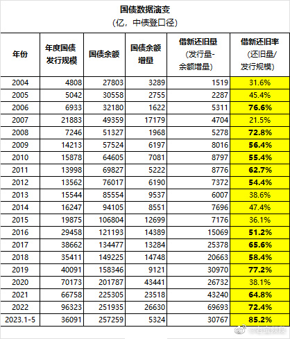 这就是为什么我国今年货币膨胀得相当厉害,5月份的M2(货币总量)达到282.05万亿,较2022年5月的252.70万亿,同比增幅为11.6%,但各行各业都缺钱的原因。因为印出来的钱大都拿去还旧债了。我举个例子,今年1-5月新发行的国债规模36091亿,较2022年同期29036亿,增幅高达24.3%。看起来国家应该有钱拉动基础设施投资了似的。但是这笔钱的85.2%,都被拿去还旧债了。真正可以拿来花的部分,只剩下5324亿(图2)。为什么现在偿债压力这么大,因为过去3年,政府的债务规模膨胀了足足6成。这就意味着政府如果要有钱拉动投资,就需要发更多的债,增幅24%是远远不够的,至少要达到50%。每年50%的国债发行规模增幅是什么概念各位可以理解吗?这就是摆在各位面前的滚雪球效应,活生生的例子。
