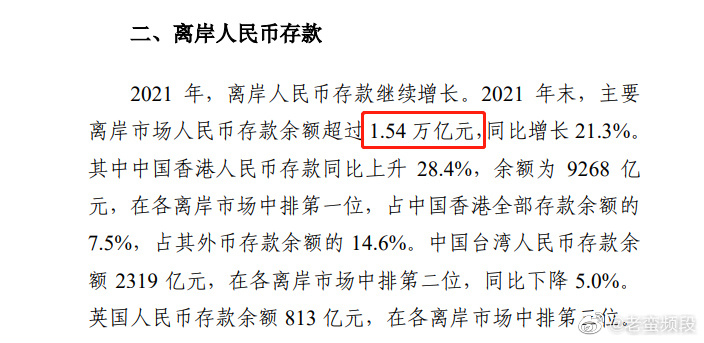 央行每年都会发布《人民币国际化报告》,一般都是9月份发布上一年的数据,2022年的数据还没出来,我们就看2021年的好了(网页链接)。根据央行的报告,2021年底的离岸人民币存款规模1.54万亿。也就是图一的数据。