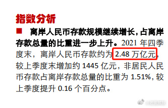 但是,中国银行给出了完全不一样的数据,它每个月都会发布离岸人民币指数报告,在2021年12月份的报告里(网页链接),中国银行给出了完全不同的数据:2021年底的离岸人民币存款规模2.48万亿。也就是图二的数据。