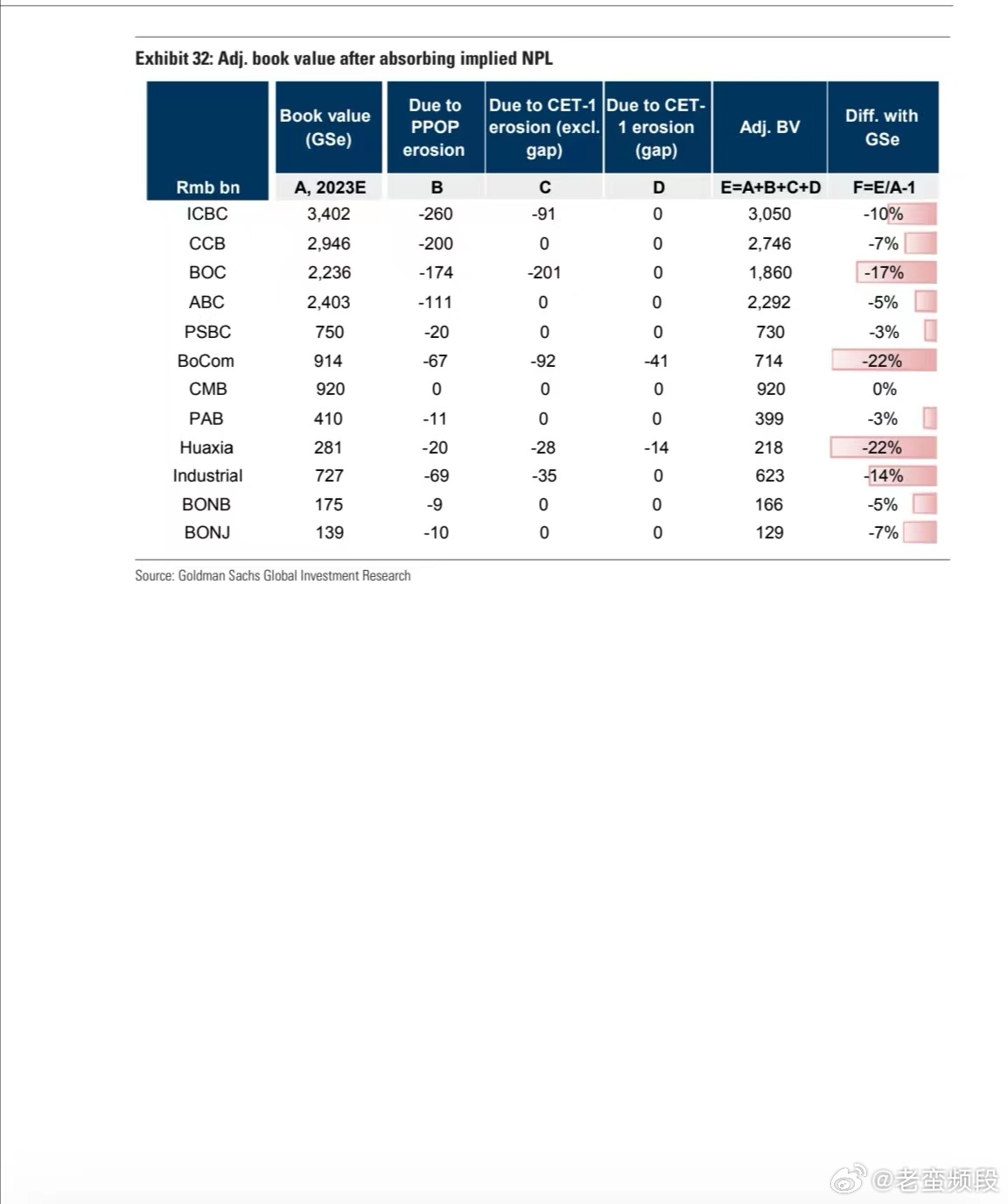 看完了高盛看空中国银行业的78页报告。我的评价只有一个:看得还不够空。高盛的研究团队主要的着眼点就是地方债,它能找到数据的就是底下这12家大型银行,拿来翻来倒去写了70多页,说它们介入地方债太深,隐藏的坏账太多,如果坏账爆发就会跟下图一样资产减值。