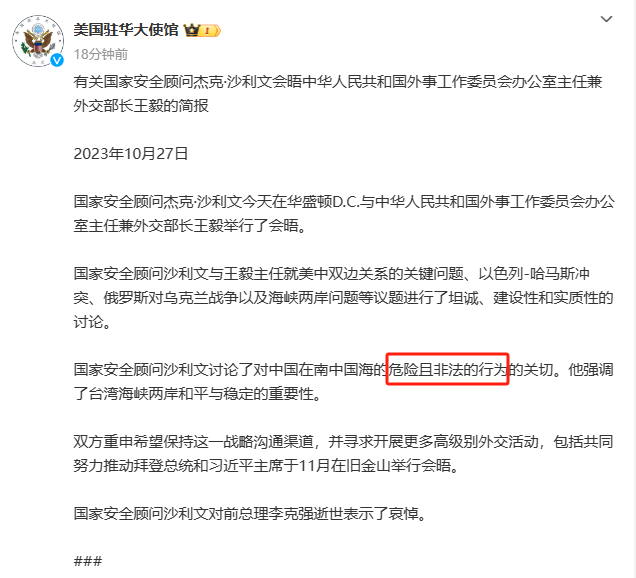 美国国务卿昨天发布的会谈简报,在表达上还比较温和,美国国家安全顾问刚刚发布的声明,我截图在了下面,甚至直接给中国的南海行动定了性,“危险且非法”。这种直接的定性是很少见的,这跟打脸没啥区别了。