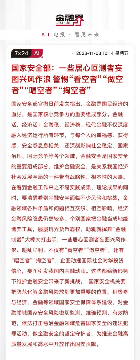 现在的金融危险到什么程度了呢?需要国安部跳出来,赤裸裸的威胁市场,不允许发表看空言论。至于做空,甚至已经不是简单的违法了,而是属于危害国家安全的重大恶性犯罪行为,要由国安部亲自处理了。