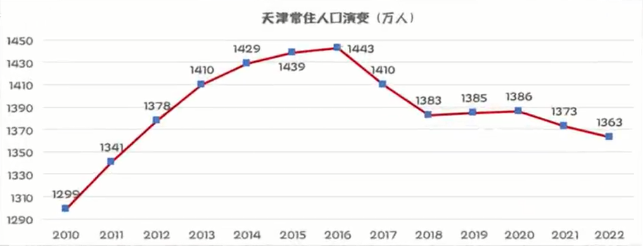 产业经济不行,天津当然也留不住人口。不同于一直以来以强硬态度驱赶低端人口的北京政府,天津政府一直想尽了办法吸引人口流入,天津是全国二线城市里第一个放开户籍限制的城市,然而并没有什么卵用,2016年天津的人口达到1443万的峰值,此后就掉头向下,2018年天津人口下行到1383万人。天津政府实在受不了了,于是连续开启了所谓“抢人大战”和“海河英才”行动,引入了近40万人才以缓解人口流出的压力。但是在天津产业清零的背景下,这种引进的人才其实也找不到什么活干,因此注定不可能长久。所以,2021年之后天津的人口再次下行,2022年已经下降到了1363万,就天津的这种人口下降幅度,简直就跟经济陷入绝对萧条状态的东北一模一样。